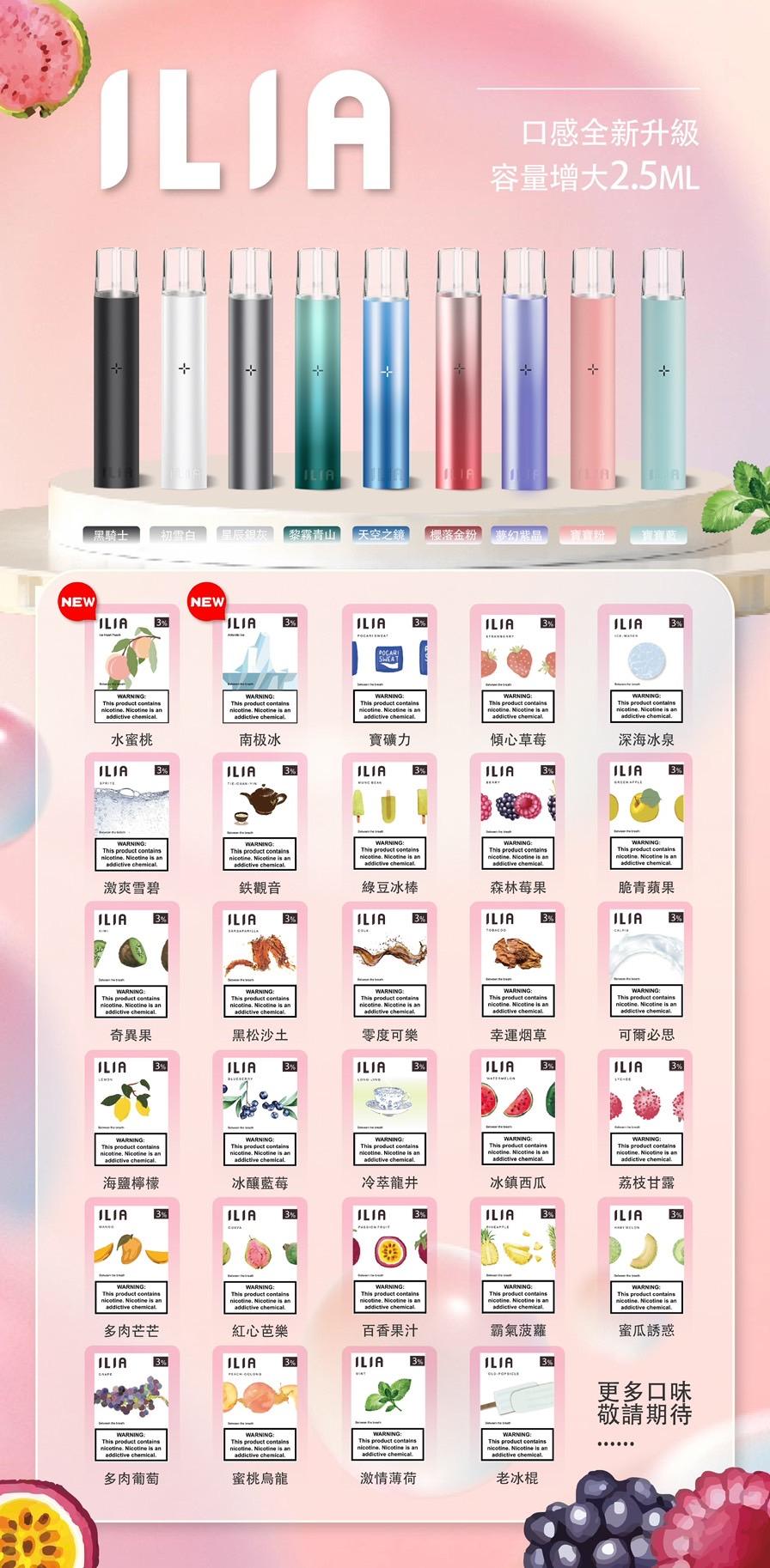 ILIA電子煙,為台灣市場帶來全新體驗。我們的產品線包括多口味煙彈、高效能主機和高品質煙油,旨在為消費者提供便捷、健康、時尚的吸煙新選擇。無論您是電子煙新手還是老手,都能滿足您對電子煙的一切需求。ILIA與悅刻電子煙通用,請放心使用~